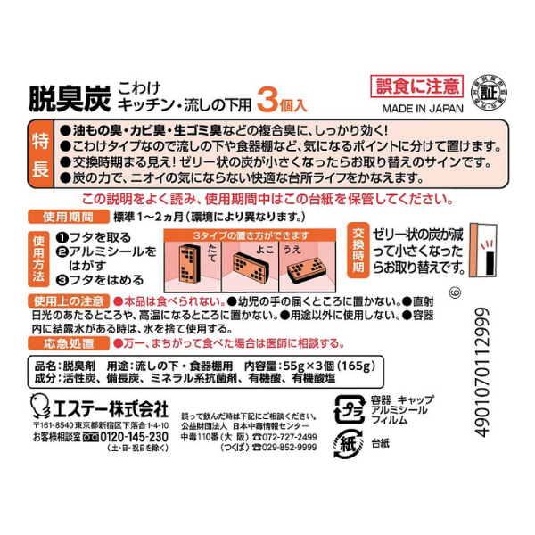 エステー 脱臭炭 キッチン流しの下用 こわけ3個入 [消臭剤 キッチン]