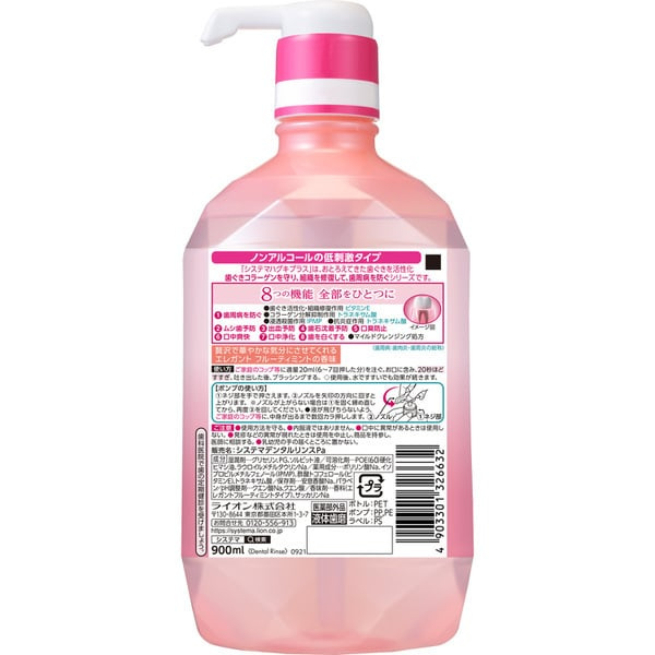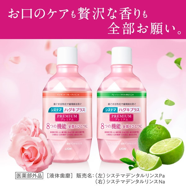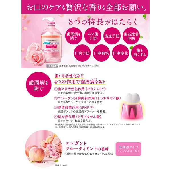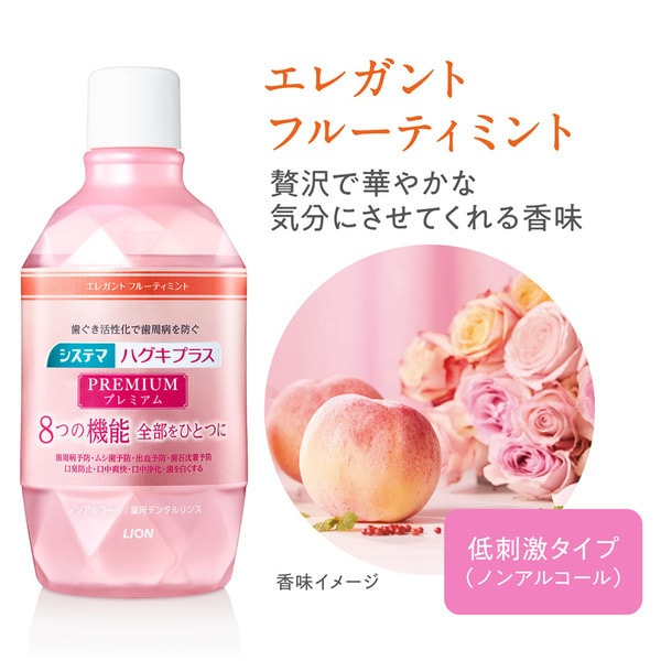 「ライオン LION システマ ハグキプラスプレミアム デンタルリンス 低刺激ノンアルコールタイプ エレガントフルーティミント 900mL【医薬部外品】」は、歯ぐきの健康を守る8つの機能がひとつになった薬用デンタルリンスです。