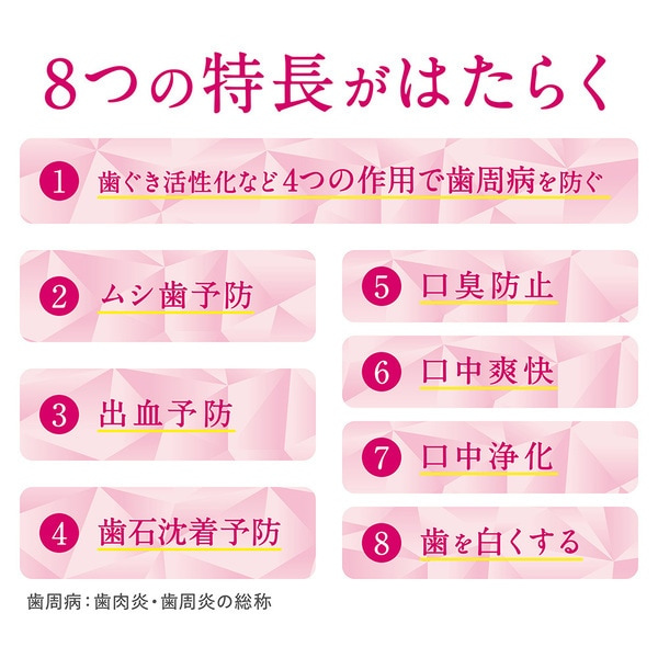 歯周病やムシ歯、出血を予防し、歯石の沈着や口臭を防止。さらに、口内を浄化し、歯を白くしながら爽やかな息を保ちます。