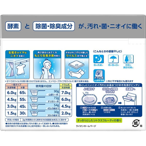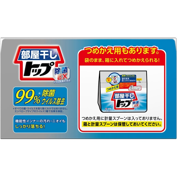 ダブル除菌成分と酵素、除臭成分の力で、汚れ・菌・ウイルスまで落とす※「部屋干しトップ 除菌EX 900g」。
