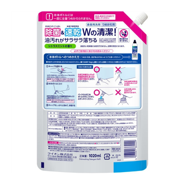 ライオン LION チャーミーマジカ CHARMY Magica 速乾プラス カラッと除菌 シトラスミントの香り つめかえ用 1020mL [食器用洗剤]