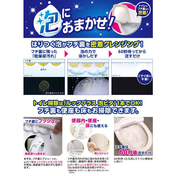 届いて溜まる泡で効率的なお掃除を実現するため、必ず「ルックプラス 泡ピタ トイレ洗浄スプレー」に詰め替えてお使いください。