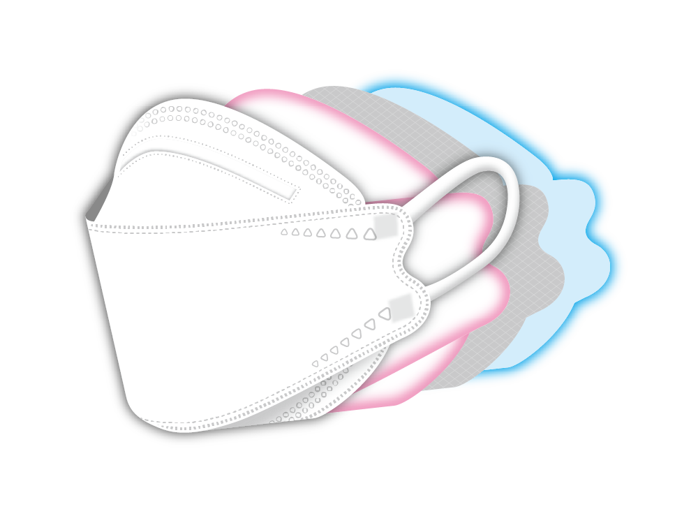マスク最外層にスパンレースを採用。 素材自体を柔らかくすることで従来より 上下の動きに追随しやすい仕様に。さらに鮮やかなカラー展開を実現できました。