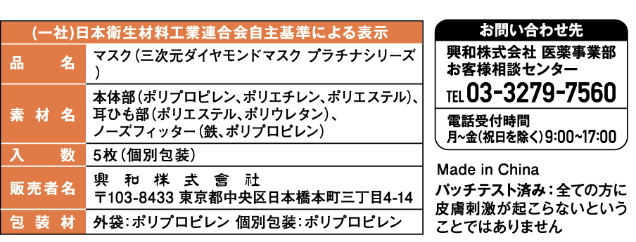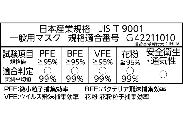 三次元ダイヤモンドマスクは、「JIS T 9001」 一般用マスクとしての品質試験項目に適合しています。 規格適合番号 G42211010 (日本衛生材料工業連合会が運用するJIS適合審査です。)