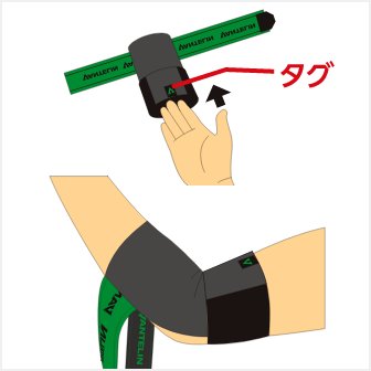 タグがひじの内側にくるように、腕を通してください。穴空き部がひじ頭にくるように調節してください。