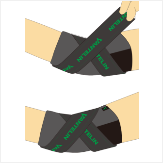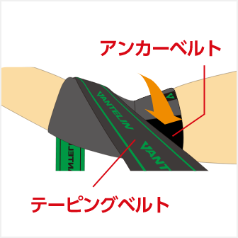 ひじを軽く曲げた状態で、ひじの外側のテーピングベルトを内側に引っ張り上げ、アンカーベルトに留めます。