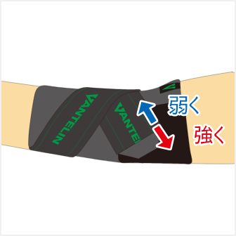 同様にひじの内側のテーピングベルトを外側に引っ張り上げ、アンカーベルトに留めます。