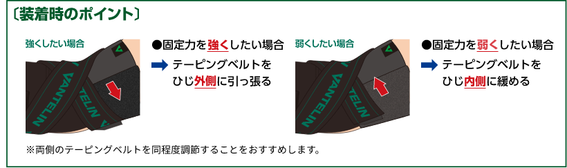 固定力を調節したい場合はテーピングベルトの留める位置で調節してください。