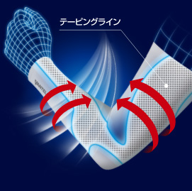 筋肉の構造に沿ったテーピングラインが、筋肉や脂肪の無駄な動きを抑え、手首から上腕にかけて腕全体を適度に着圧します。