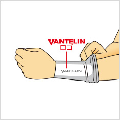 ・本体(上部そで口付近)に記載されたR(右腕用)とL(左腕用)の印を確認し、VANTELINロゴが手の甲側にくるように、大きい方の穴から腕を通してください。
