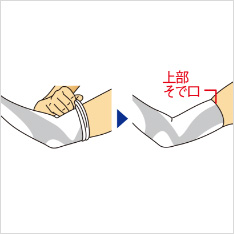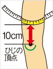 ひじを軽く曲げた状態で、イラストのように、ひじの頂点から10㎝上の周囲を目安に測ってください。