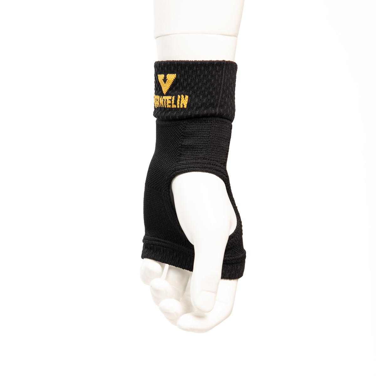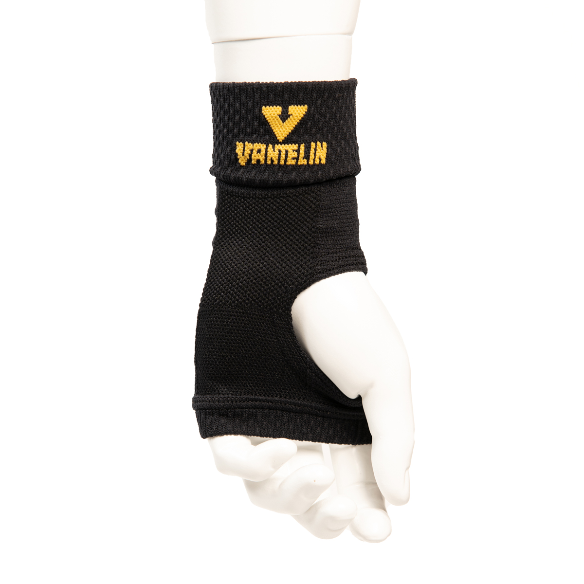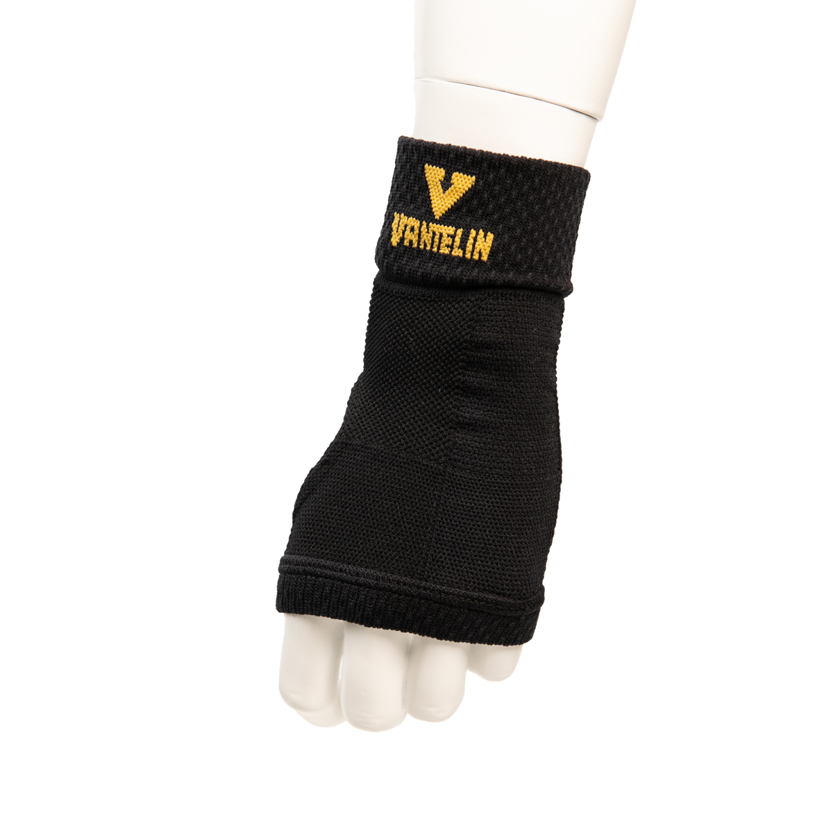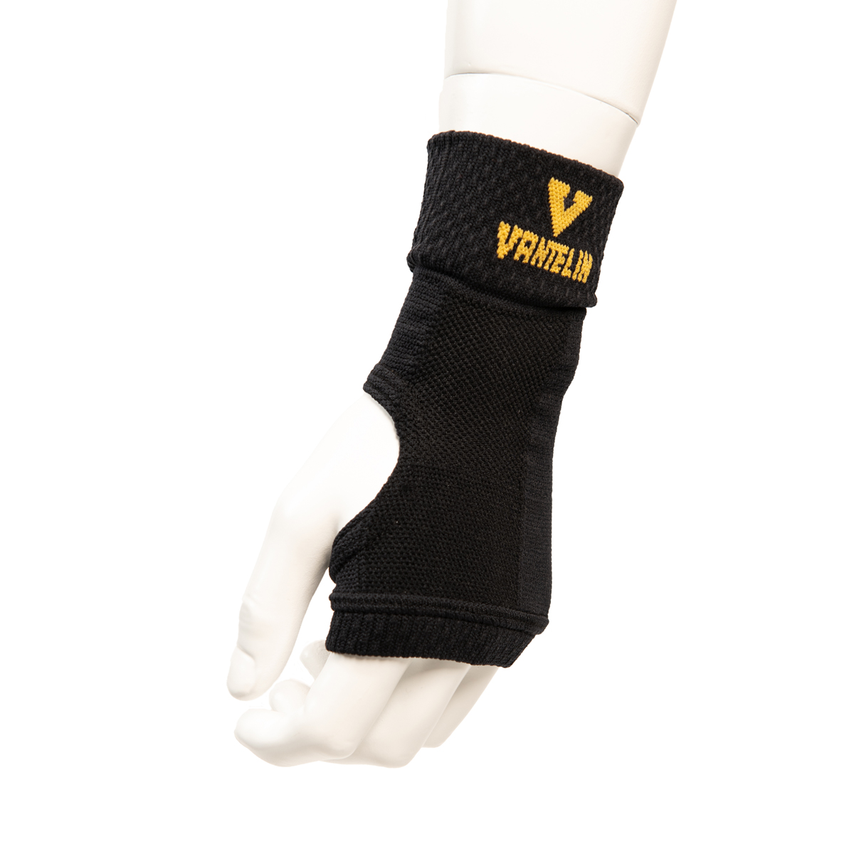 手の甲と手のひらのサンドウィッチ型テーピング編みが、添え木のように手首の過度な動きを抑制し、不安感を軽減します。