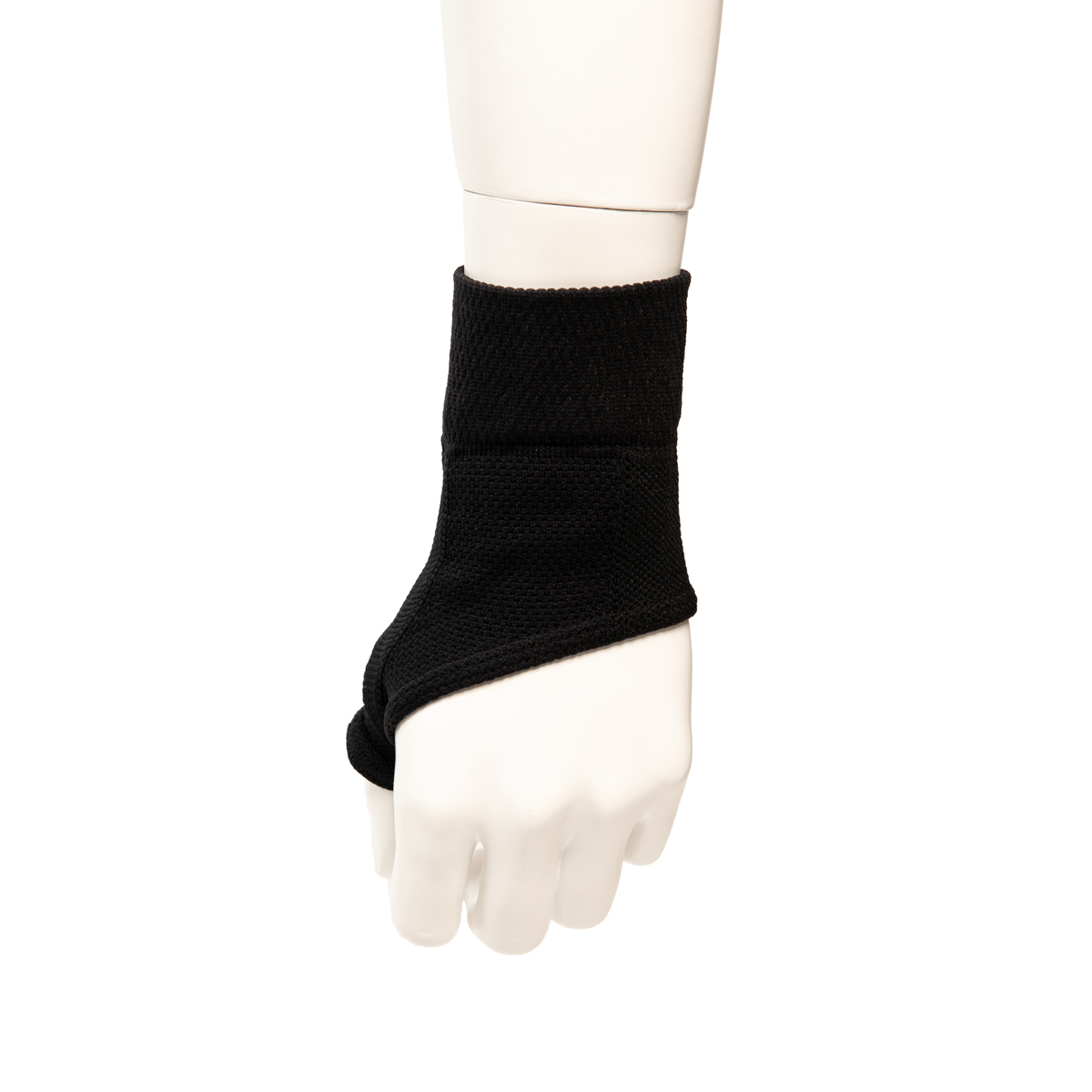 親指側と小指側のサイドサンドウィッチ型テーピング編みが、手首の左右の過度な動きを抑制し、親指の付け根の不快感を軽減します。