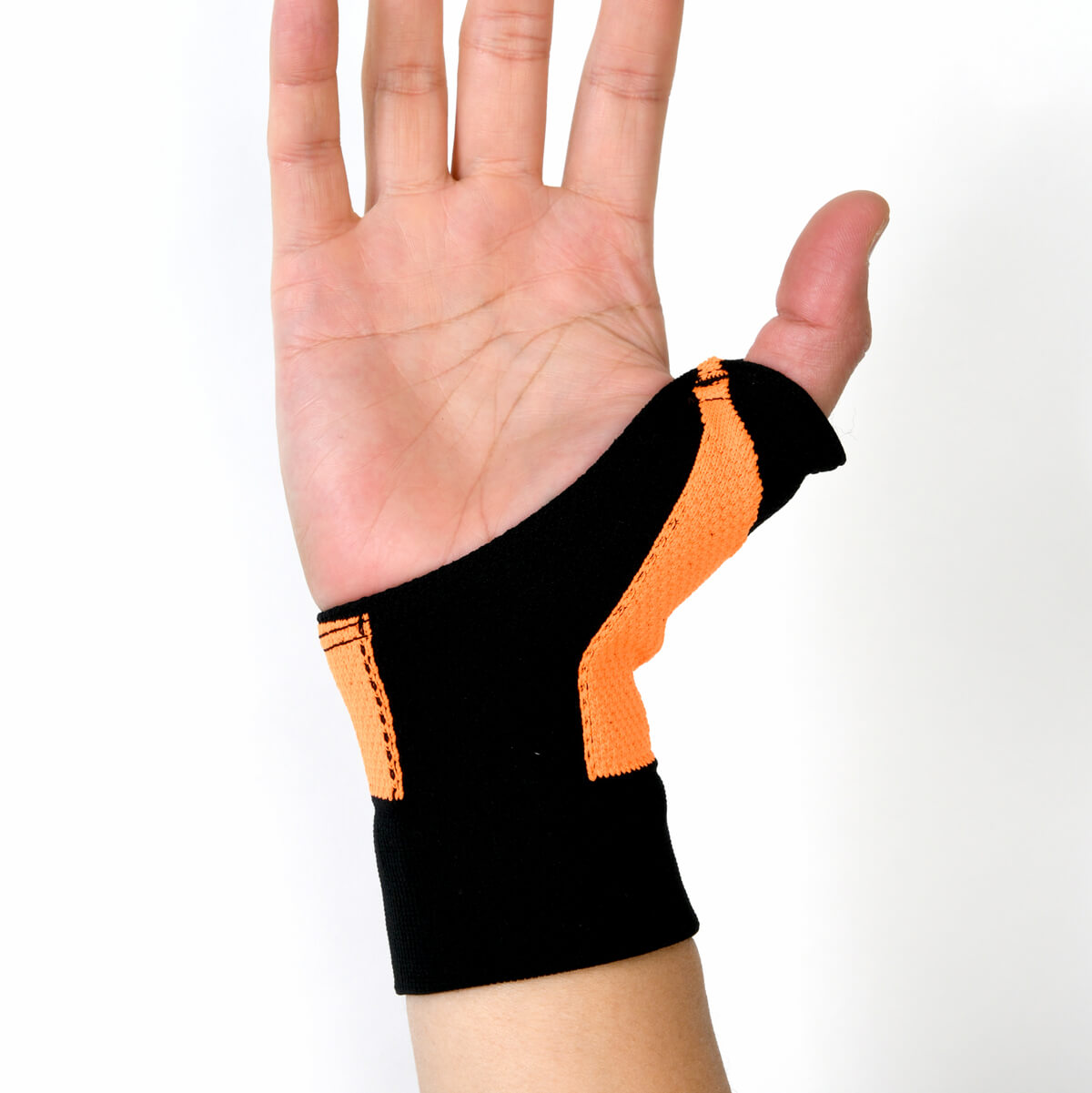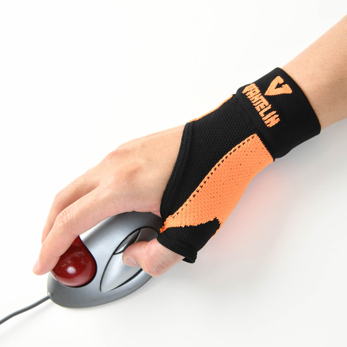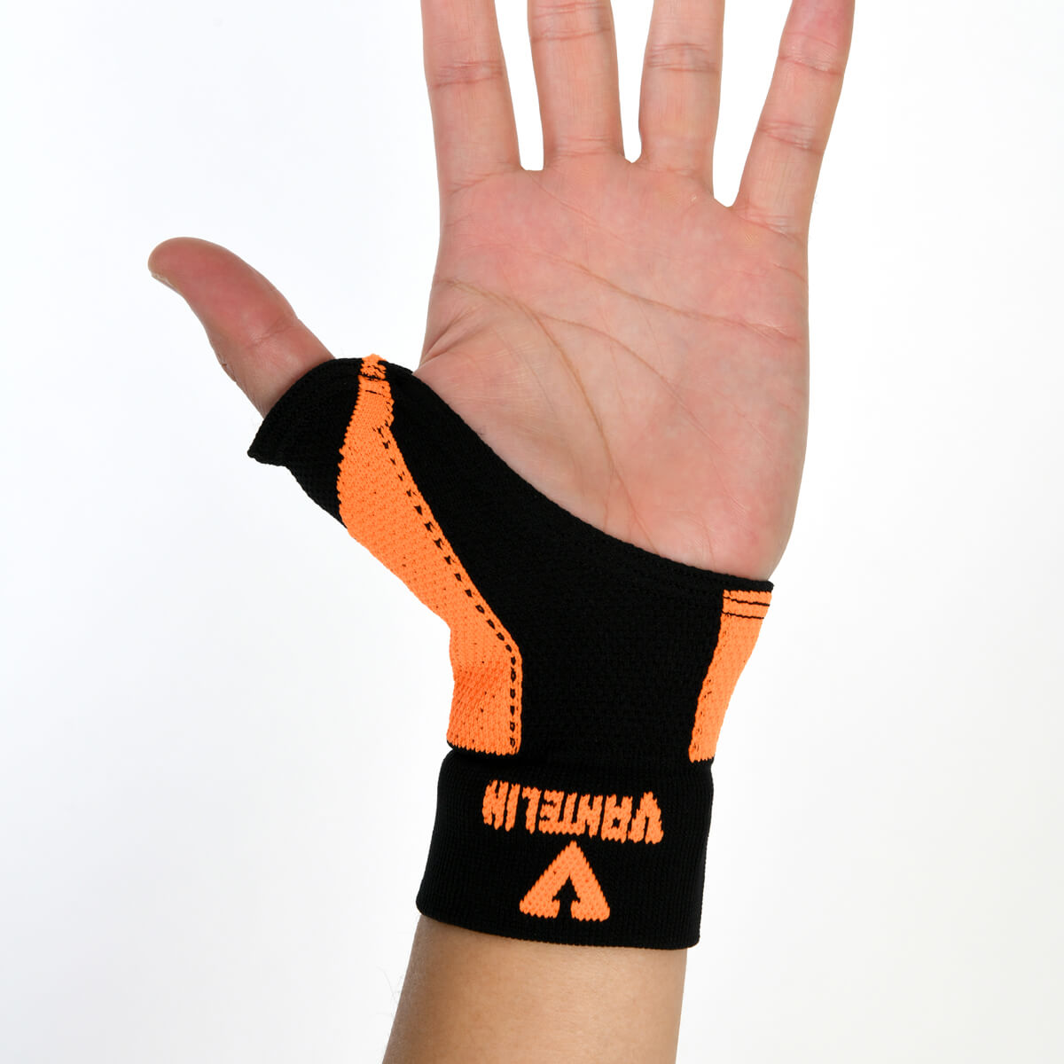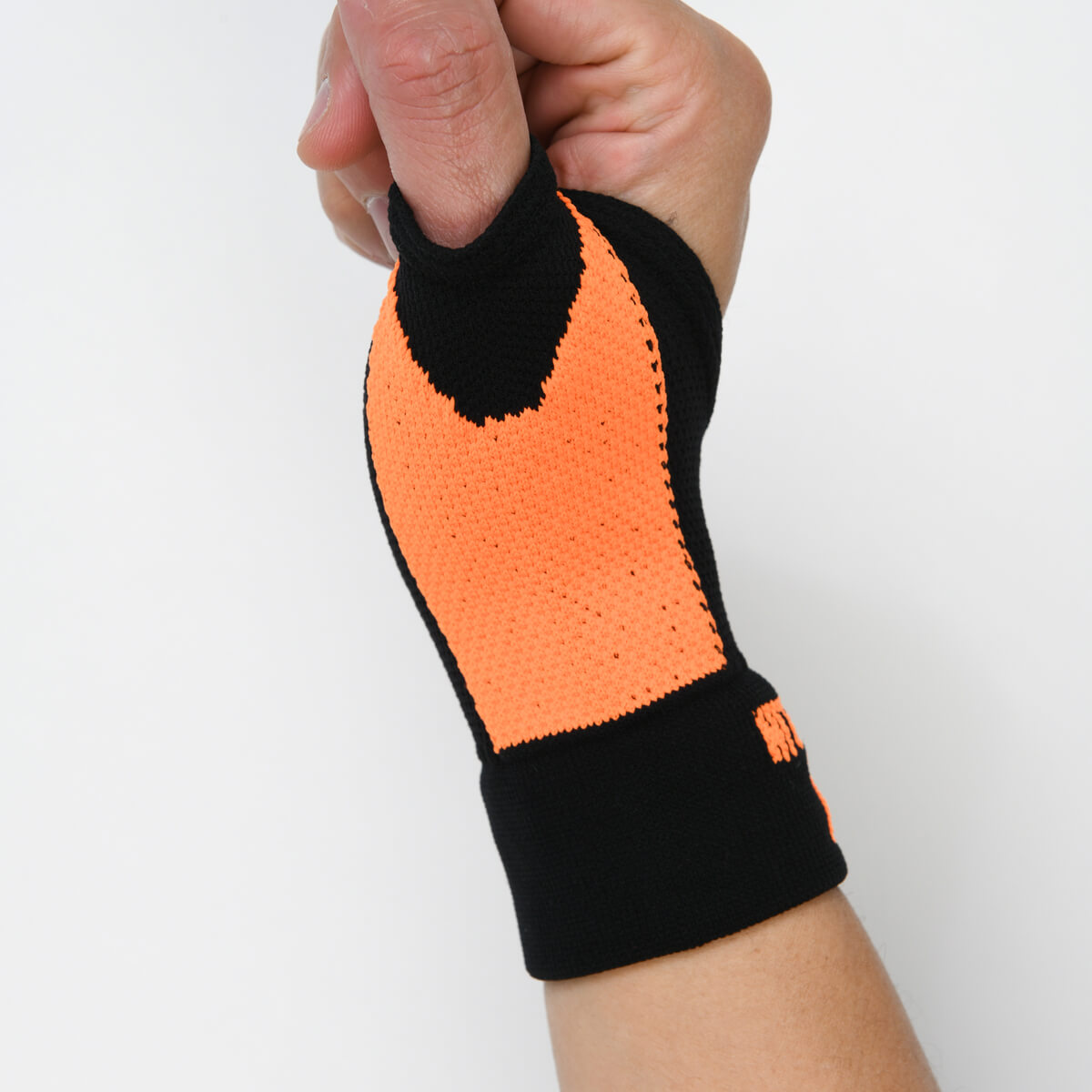 サイドサンドウィッチ型テーピング構造 親指側と小指側のサイドサンドウィッチ型テーピング編みが、手首の左右の過度な動きを抑制し、親指の付け根の不快感を軽減します。 (写真はブラック×ネオンオレンジです)