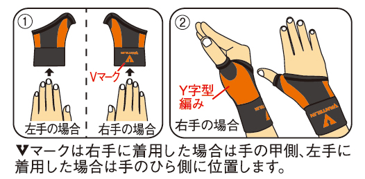 ①左図のように手を通し、小さい方の穴に親指を入れてください。 ②親指がY字型編みの中央にくるように合わせ、たるみがないように調整してください。