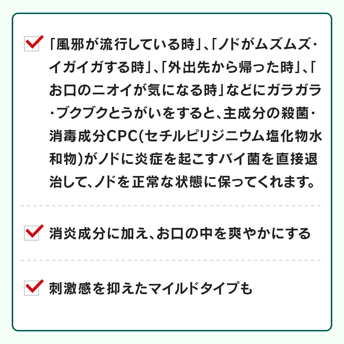 | セチルピリジニウム塩化物水和物(CPC) | 2.5mg | のどや口を殺菌・消毒します。また、防臭作用もあるため、口臭も除去します。 |