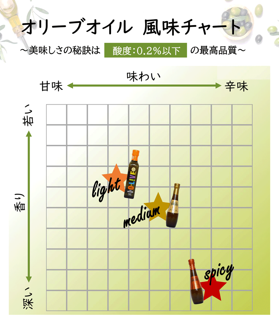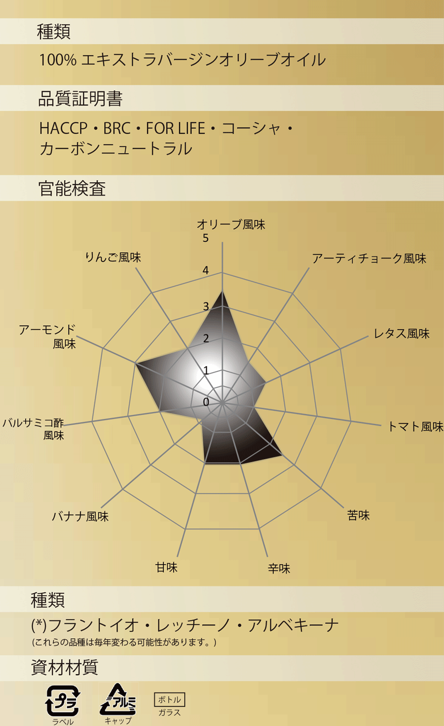香ばしい風味をもつ、フルーティーで薫り高いオリーブオイルです。 キレのある苦味と辛味があらゆる料理とマッチします。