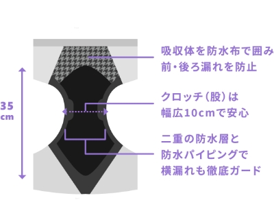 前後に伸ばした防水布と、サイドに施した防水パイピングが吸収体を囲んで漏れをしっかりせき止め、一日中安心して過ごせます。