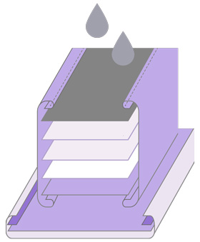 液体を吸い込む吸収体は、安心のロング&ワイド。周りを防水生地で囲んで、漏らさない設計。