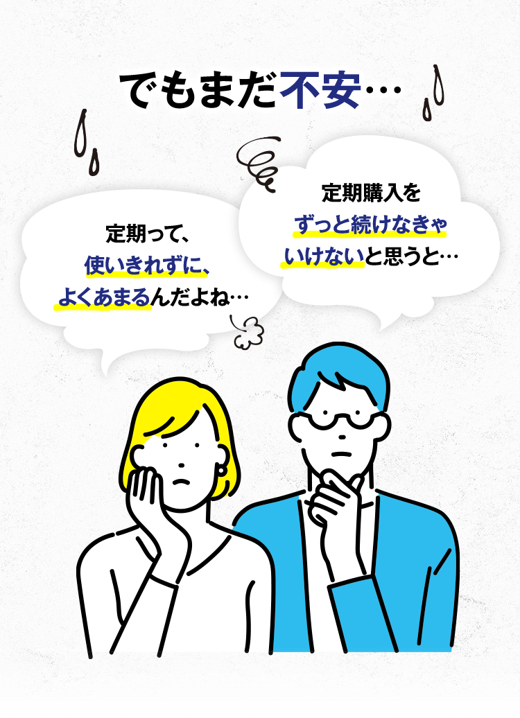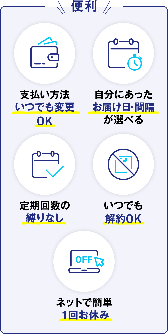 • 便利 支払い方法いつでも変更OK、自分にあったお届け日・間隔が選べる、定期回数の縛りなし、いつでも解約OK、ネットで簡単1回お休み