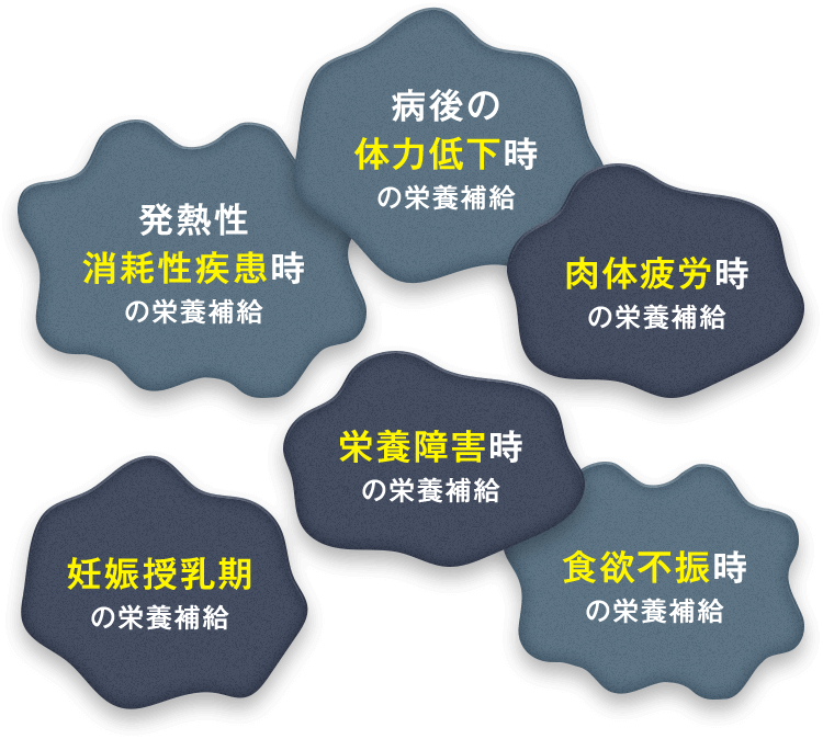 滋養強壮、虚弱体質、肉体疲労・病後の体力低下・食欲不振・栄養障害・発熱性消耗性疾患・妊娠授乳期などの場合の栄養補給