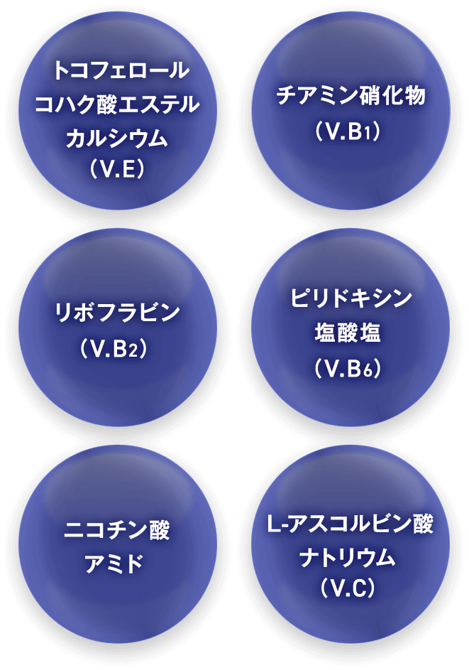 トコフェロール コハク酸エステル カルシウム (V.E)、チアミン硝化物 (V.B1)、リボフラビン (V.B2)、ピリドキシン 塩酸塩 (V.B6)、ニコチン酸 アミド、L-アスコルビン酸 ナトリウム (V.C) 6種のビタミンの補給により、疲労などへの効果をサポートします。