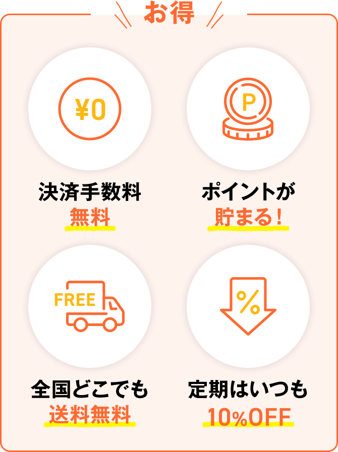 • お得 決済手数料無料、ポイントが貯まる!、全国どこでも送料無料、定期はいつも10%OFF