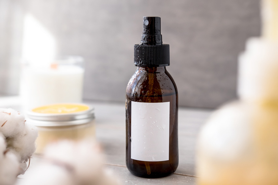水と精油を混ぜ、遮光瓶のスプレーボトルに入れてよく振って、簡単なルームスプレーを作り空気中に噴いて香りを楽しめます。