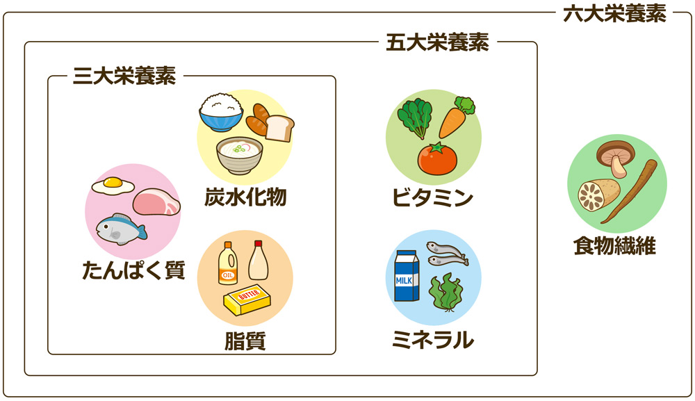 三大栄養素にビタミン・ミネラルを加えたものを「五大栄養素」、さらに食物繊維を加えたものを「六大栄養素」と呼びますが、今回はそれらの栄養素とその働きについてご紹介します。