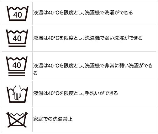 一番下の表示のように、家庭での洗濯禁止のマークがついていれば自宅での洗濯には向きません。他にも、適した水温や手洗いなのか、洗濯機で洗えるのかといった、洗濯に必要な情報が表示されています。