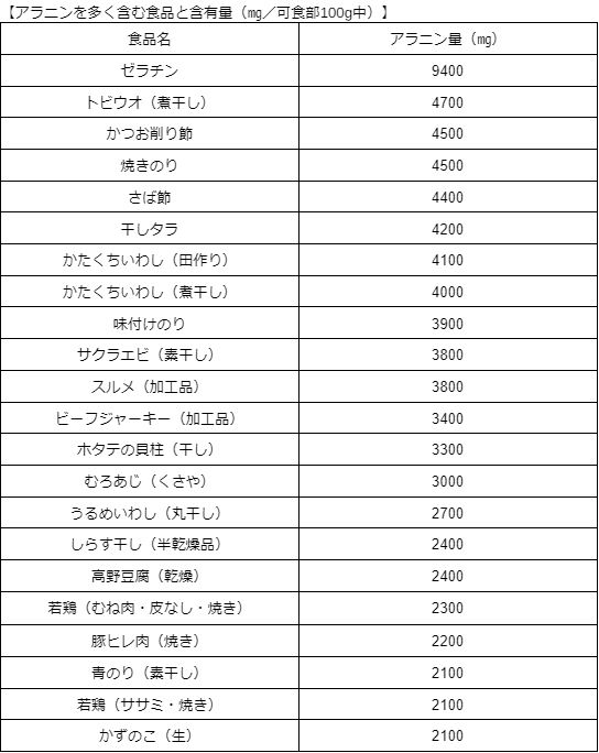 上記の表を確認すると、アラニンが多い食品は、乾物に集中しています。