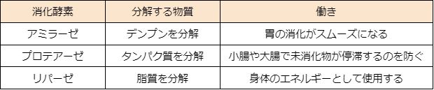 例えば、食物酵素が不足していると、消化酵素の力のみで食べ物の分解・吸収をおこなわなければなりません。一方、食物酵素を積極的に摂取していると、食物酵素が食べ物の消化を助けてくれるため、消化酵素の浪費を防げます。
