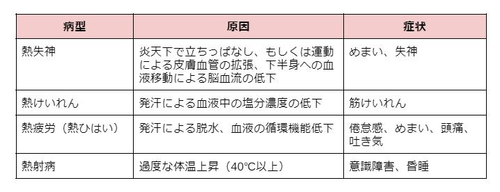 めまいや失神などの症状が出る熱失神は、炎天下で立ちっぱなし、急に立つ動作で血液が下半身に移動し、脳血流が低下すると起こります。熱けいれん、熱疲労、熱射病は、発汗による塩分など電解質の濃度低下が主な原因です。