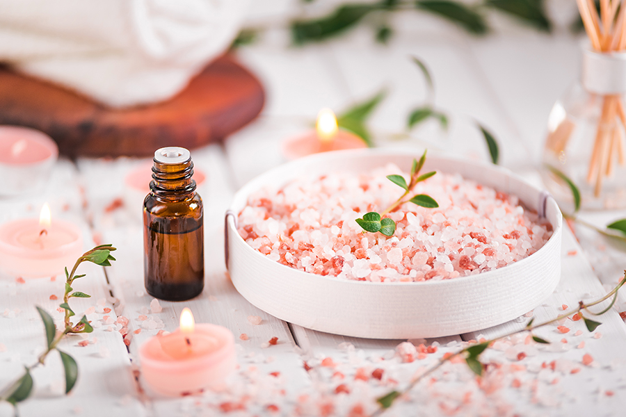 バスソルトにホホバオイルや好みのキャリアオイルを加えると、手軽にマッサージソルトを作れます。粒子の細かいバスソルトを選ぶと、肌あたりが滑らかになります。