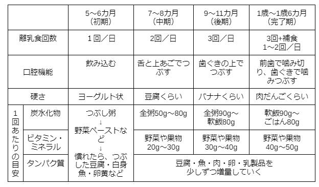 生後5~6カ月頃から、乳汁だけではタンパク質や鉄分が補いきれなくなってきます。そのため、乳汁以外の食べ物から栄養を補給する練習をスタートさせるのです。1歳~1歳6カ月頃には幼児食に移行します。