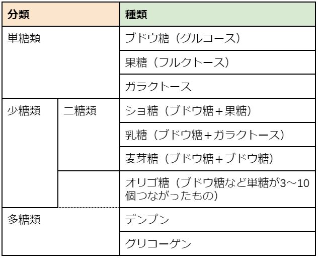 糖質は下記の表で示したように単糖類、少糖類、多糖類に分類されます。私たちが食事をすると、摂取した炭水化物は唾液などに含まれる消化酵素のアミラーゼにより「二糖類」まで分解され、最終的に「単糖」となり体内に吸収されます。