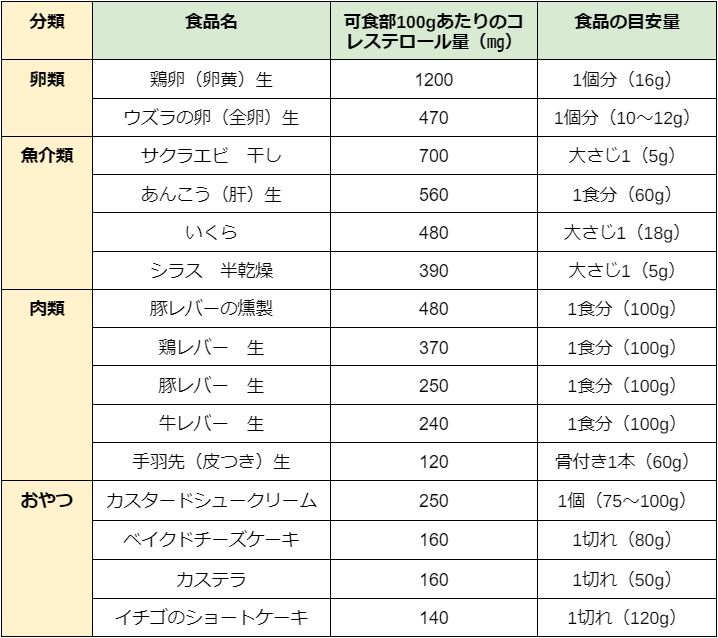 コレステロールを多く含む食品は、以下のとおりです。