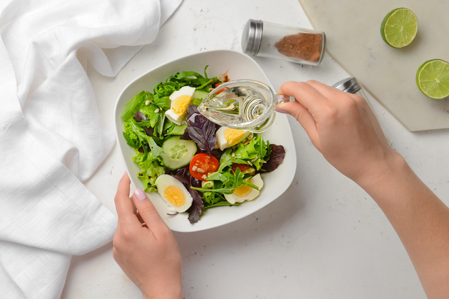 MCTオイルはドレッシングとして取り入れると、いつものお料理に手軽にプラスできます。普通のドレッシングにMCTオイルを混ぜると脂質の量が増えてしまうため、ノンオイルドレッシングに混ぜるようにしてみましょう。