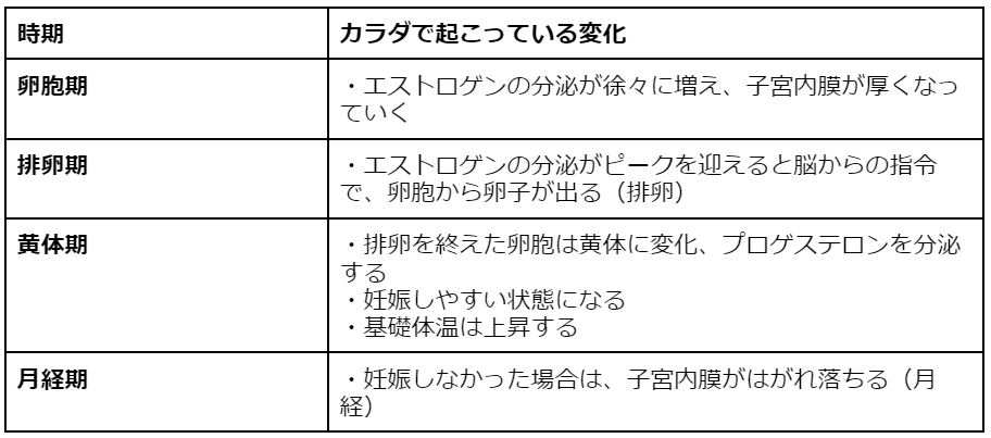 およそ28日周期で訪れる月経は、女性ホルモンの働きで起こります。月経周期は「卵胞期」「排卵期」「黄体期」「月経期」の4つに分類され、女性ホルモンのバランスが変動します。