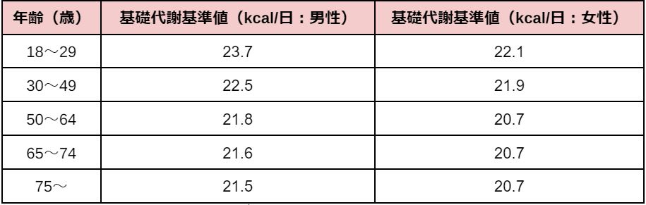 基礎代謝(kcal/日) = 基礎代謝基準値(kcal/kg/日)× 体重(kg)
