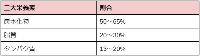 基礎代謝に関わる筋肉を効率的につけるためには、日々の栄養バランスにも気を遣わなければいけません。私たちのエネルギー源となる三大栄養素(炭水化物、脂質、タンパク質)は、以下のバランスを目安に摂取しましょう。