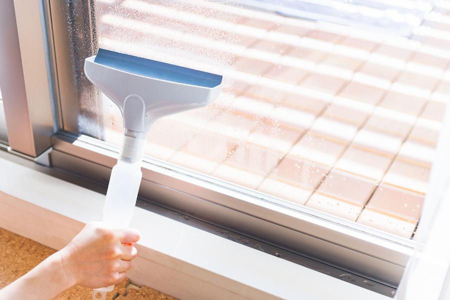 まずは、きりふきで窓全体を濡らし、スクイージーで水切りをします。仕上げに重曹水をスプレーしたマイクロファイバークロスで拭きあげましょう。乾拭きの必要はありませんが、気になる場合は乾いたマイクロファイバークロスで拭きます。
