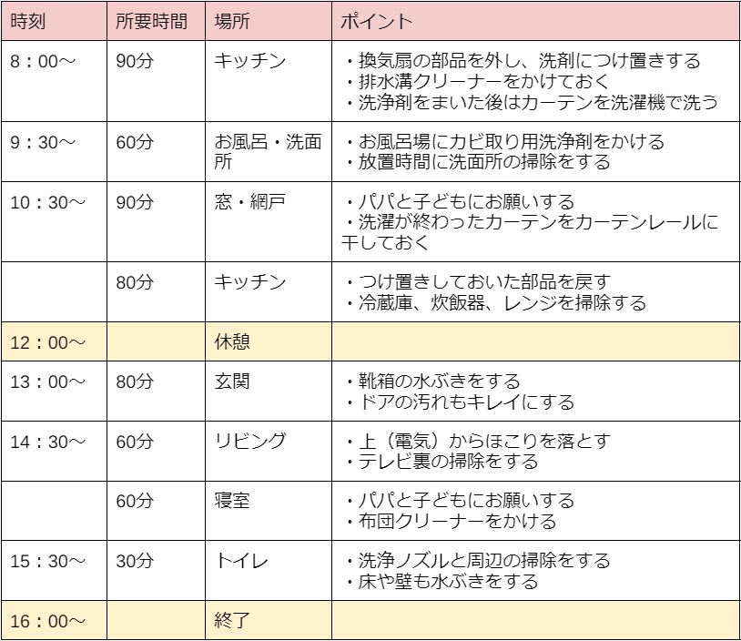 一方で、大掃除を1日で終わらせたいときは、いかに効率よく進められるかを考えたスケジュール管理が重要です。大掃除を1日でおこなうときのスケジュールの例を紹介します。
