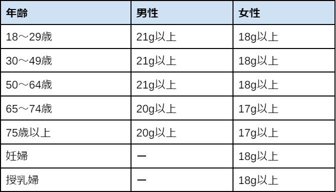18歳以上の男性は20~21g以上、女性は17~18g以上が目安です。