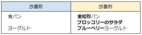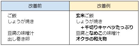先ほど紹介したポイントを実際の食生活に活かすには、どのようにするとよいのでしょうか。具体的なメニューをあげて、食物繊維を強化できる改善ポイントを紹介します。