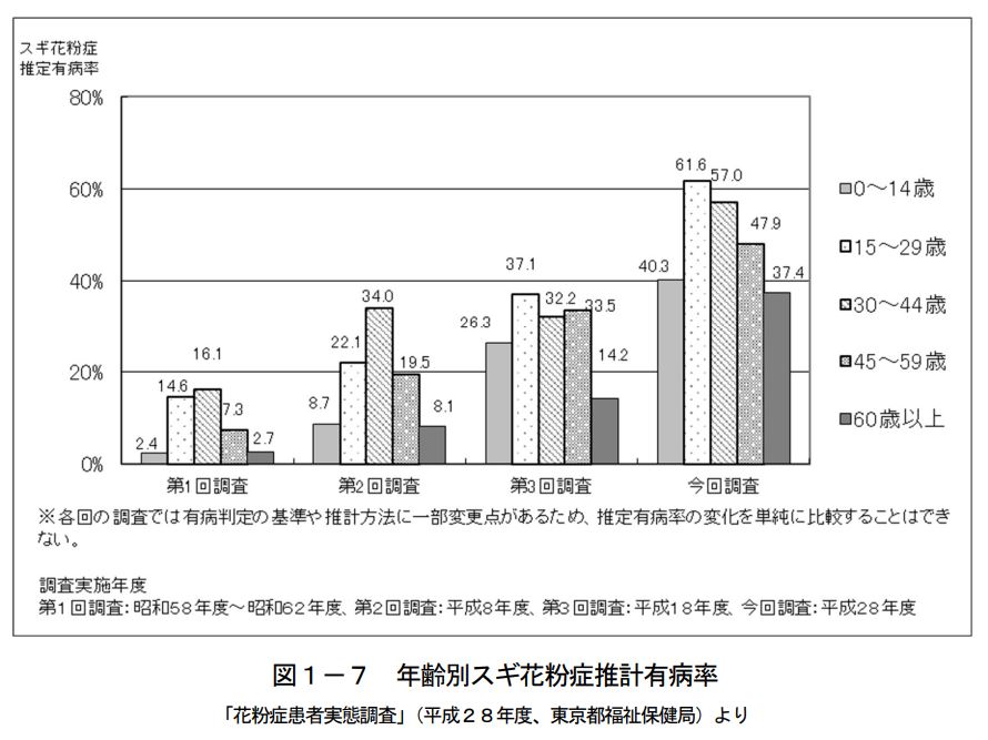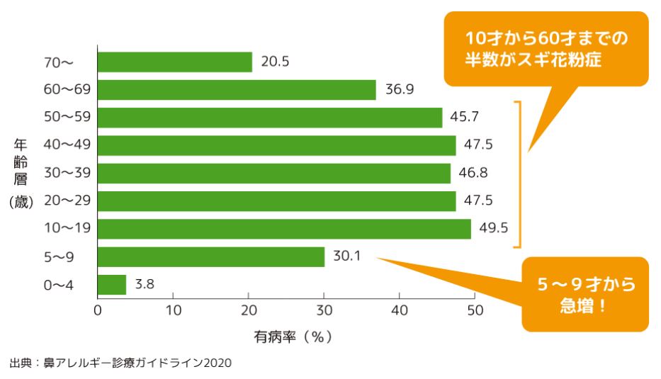 今や国民の多くが悩まされる花粉症。とくに10歳以上の発症率が高く、10歳から60歳までの半数がスギ花粉症とする調査結果もあります。