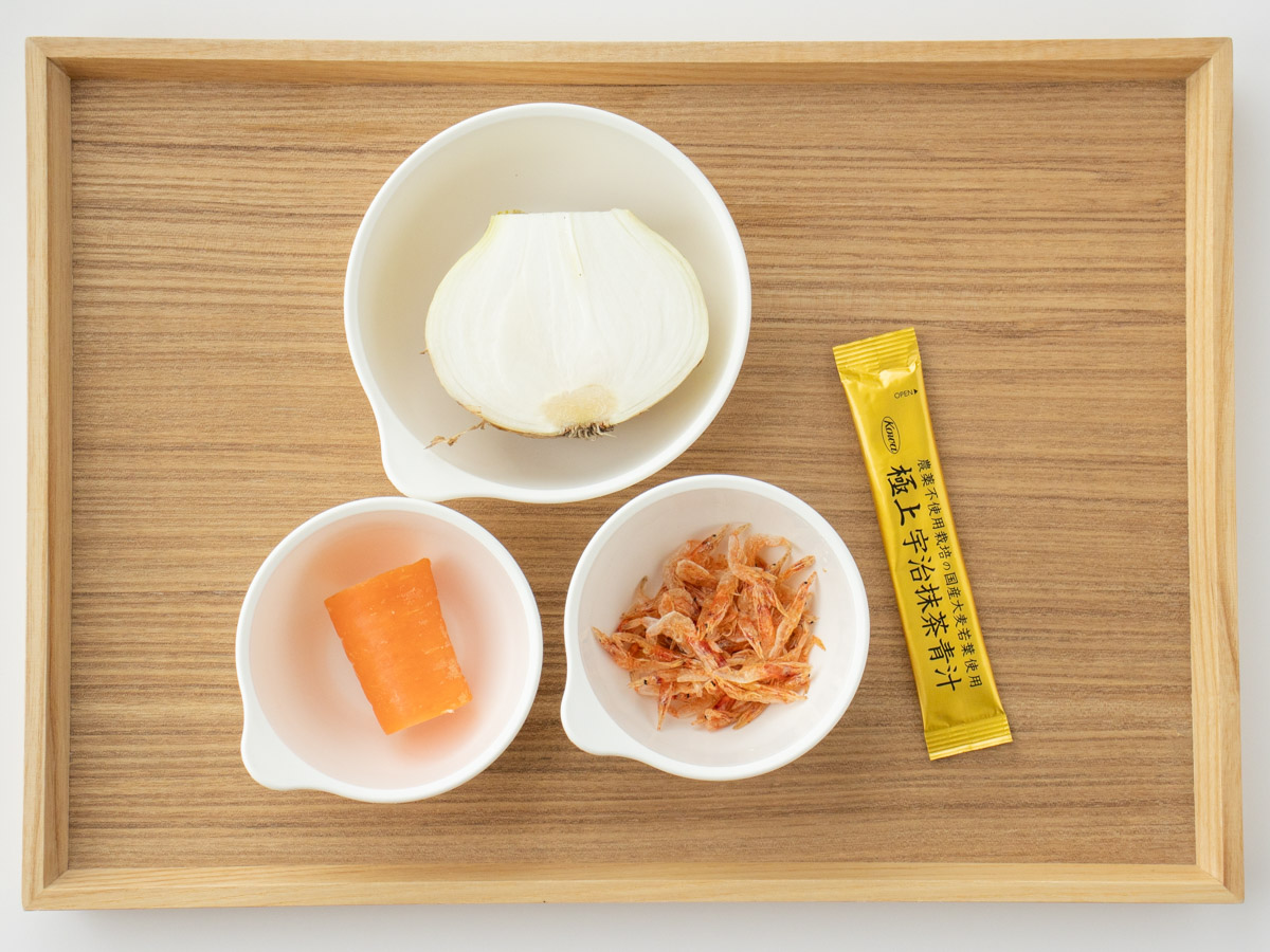• ①玉ねぎは薄切りにし、キッチンペーパーで水気をとります。にんじんは千切りにします。桜えびは水小さじ1(分量外)をまぶして水分を吸わせます。