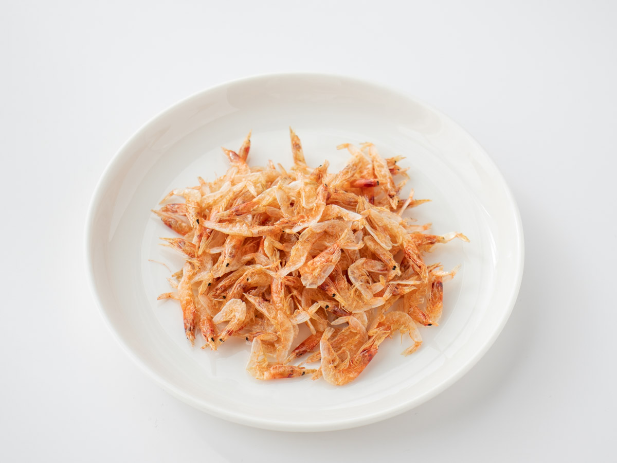 今回のレシピでは使いやすい乾燥(素干し)のものを使っていますが、手に入れば生のものを使うとさらにおいしくできます。生の桜えびを使う場合は、20~30gほど使用しましょう。