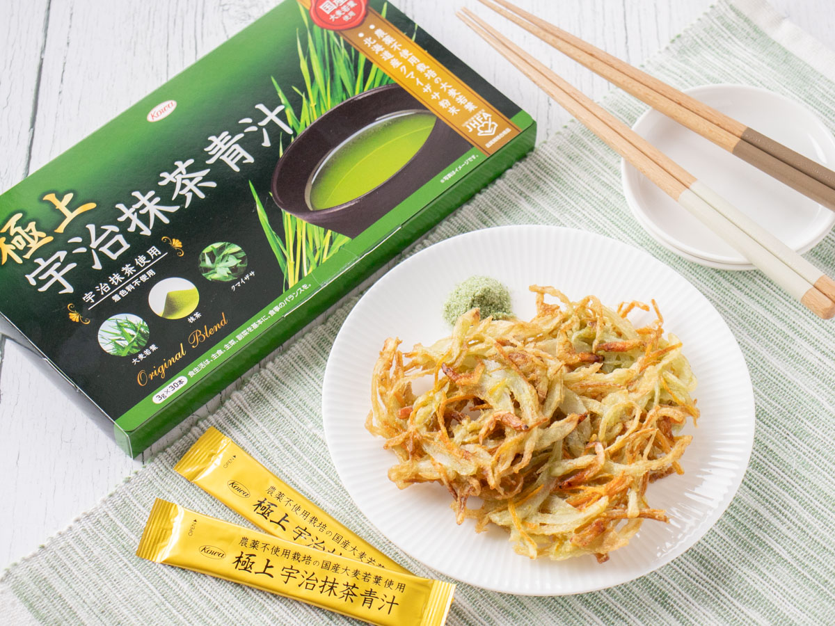 サックサクの食感が楽しい、極上宇治抹茶青汁を使ったグリーンかき揚げのレシピです。