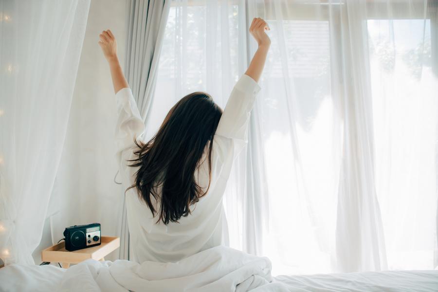 目から入った朝の光は、脳の視床下部に信号を送り、体内時計をリセットします。光を浴びるとセロトニンの分泌が促され、セロトニンがメラトニン(睡眠ホルモン)の原料になるため、夜になると自然と眠くなり、質のよい睡眠が得られるのです。